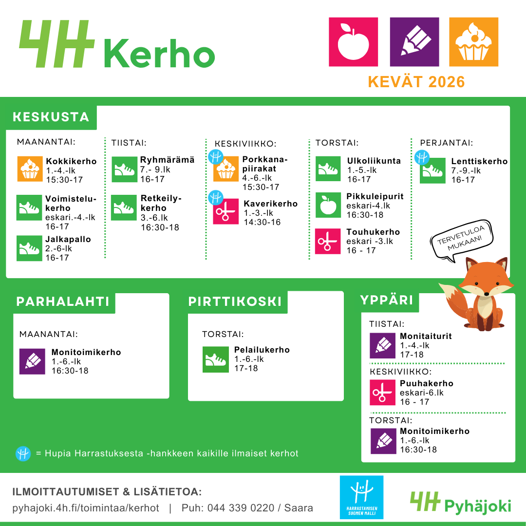 Pyhäjoen 4H- Yhdistys tarjoaa toimintaa 6-28 vuotiaille lapsille ja nuorille. Tärkeimpiä toimintamuotoja ovat kerhotoiminta, kurssit, leirit ja nuorten työllistäminen. 4H-harrastus tukee lapsen ja nuoren kasvua aktiiviseksi, suvaitsevaksi, vastuulliseksi ja yritteliääksi.
